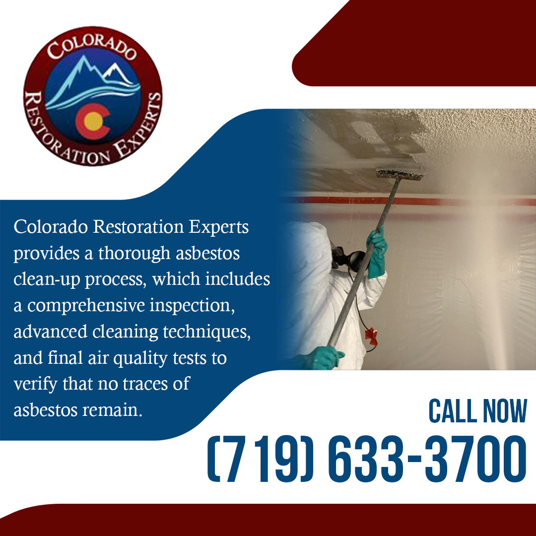 Ensuring complete safety requires meticulous clean-up to eliminate any remaining traces of asbestos. Colorado Restoration Experts provides a thorough asbestos clean-up process, which includes a comprehensive inspection, advanced cleaning techniques, and final air quality tests to verify that no traces of asbestos remain.